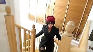 big platinum-blonde mit immensen bauch suzie in schwarzen schuhen zieht sich aus und entwässert