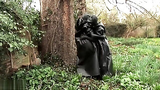 Super busty black-haired in tight latex dress bounds herself to the bed