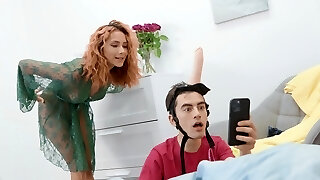 A gorgeous buxomy girl very first has sex with her boyfriend in sofa and then she fucks with another hottie with strapon